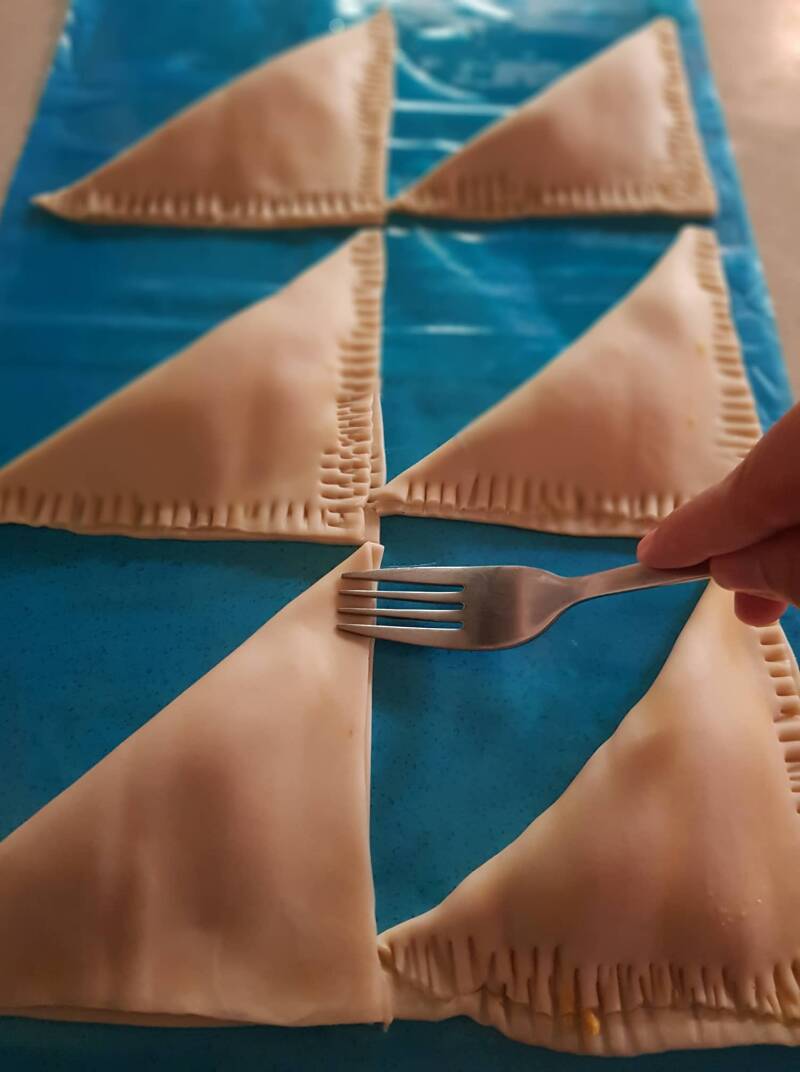 • Ανοίγεις τα τετράγωνα της ζύμης και τοποθετείς πάνω τη γέμιση ~2κ.σ κλείνεις πάλι σε τρίγωνα, κολλάς  τις άκρες με νερό πατάς καλά με πιρούνι και αλείφεις τα πιτάκια επίσης με νερό.